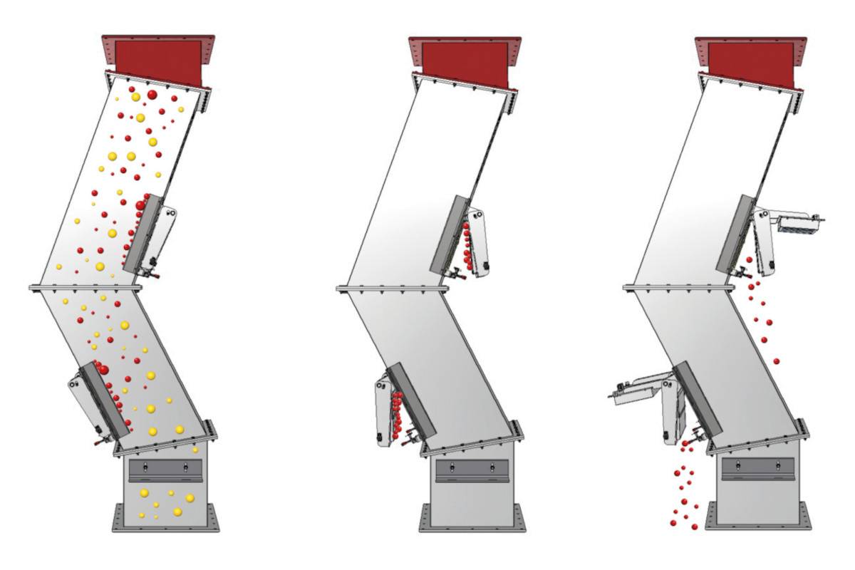 Пластинчатый железоотделитель в самотёчном трубопроводе способен обрабатывать чрезвычайно большие количества материала (до 350 м3/ч), поскольку магнитные пластины размещены в стенках сепаратора и не ограничивают свободный поток материала. Таким образом, каскадный магнит можно использовать для плохо проницаемых материалов, которые могли бы заблокировать магнитные решетчатые сепараторы. Каскадная форма сепаратора замедляет поток материала и многократно направляет его к магнитным пластинам, значительно повышая эффективность магнитной сепарации. Перемешивание материала при прохождении потока через центральную часть коленчатого корпуса железоотделителя способствует качественной очистке материала на следующей магнитной пластине.