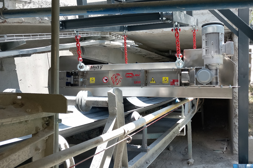 Магнитные плиты с автоматической очисткой устанавливаются либо поперечно над конвейером, либо продольно над пересыпкой (концевым барабаном) — в зависимости от характера материала и рабочих условий.